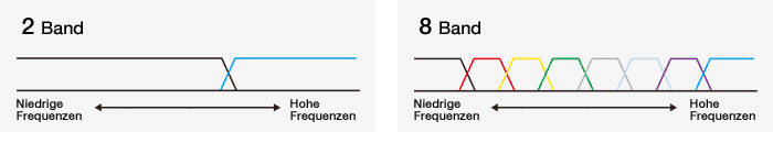Die Aufteilung der Bereiche für die Bildauswertung wurde verbessert. Anstelle einer herkömmlichen 2-Band*-Filterung nutzen einige JVC Projektoren eine hochpräzise 8-Band-Filterung, die ihren Teil dazu beiträgt, dass die Bildreproduktion bei unterschiedlichen Bandbreiten extrem detailgenau ist.