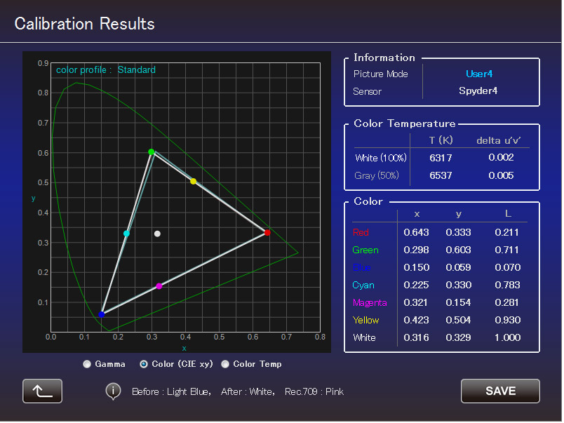 Precise calibration can be performed in just a few easy steps, so you can count on optimal images regardless of the installation situation of the projector such as its location, lens shift/zoom position, etc. What's more, it can also be used to compensate for colour balance shift that can occur when using the projector over long periods of time, assuring that the projector can always be used in optimised condition.