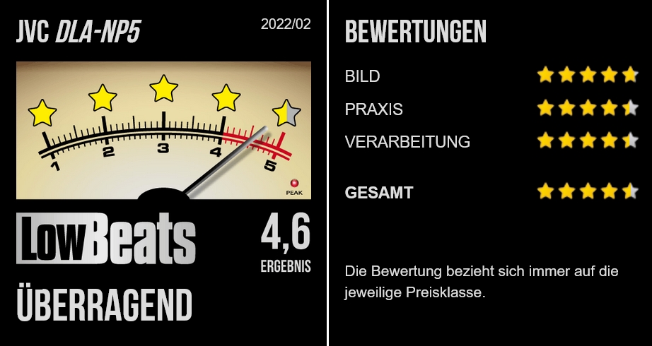„Mit dem Erscheinen des JVC DLA-NP5 vervollständigt JVCKENWOOD nun seine komplett überarbeitete NZ-Serie. Das vierte und kleinste Modell hat dabei durchaus eine Besonderheit: Denn während die „NZ“-Geschwister einen Laser/Phosphor-Hybrid als Lichtquelle verwenden (…) kommt im jetzt vorgestellten DLA-NP5 die konventionelle, bewährte Lampentechnik der Vorgänger zum Einsatz. Das aber tat seinem extrem überzeugenden Auftritt im LowBeats Heimkino keinen Abbruch. (…)
